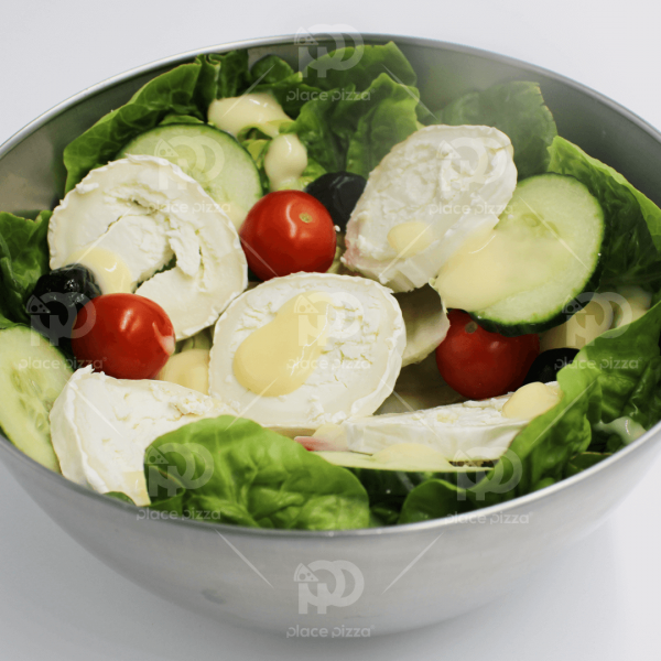 Salade, tomates, chèvre, concombre, olives, sauce salade.