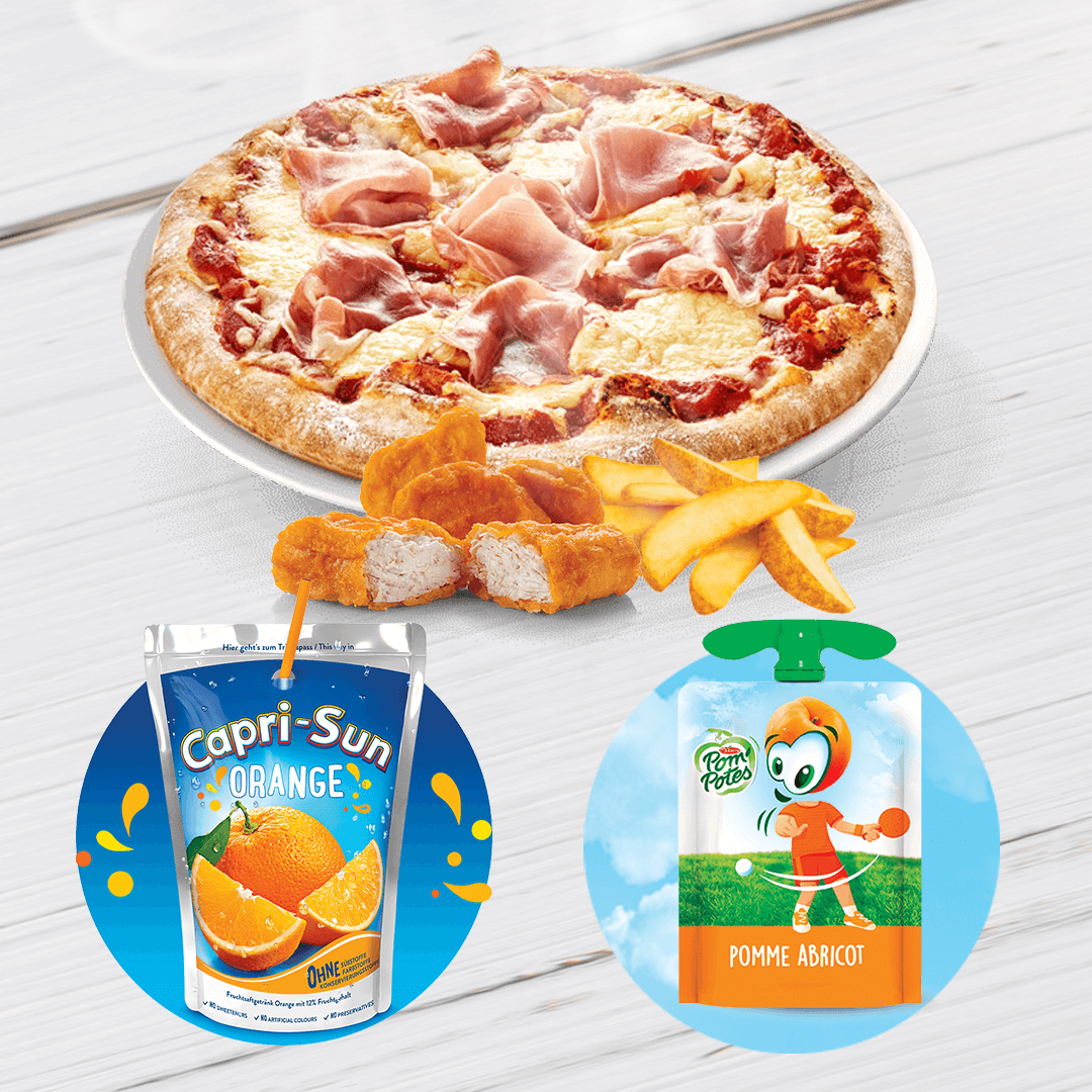 1 Mini Pizza jambon fromage ou 6 Nuggets & Potatoes + 1 Boisson non gazeux (capri-sun, tropico, oasis) + 1 Pom’potes ou 1 Surprise.